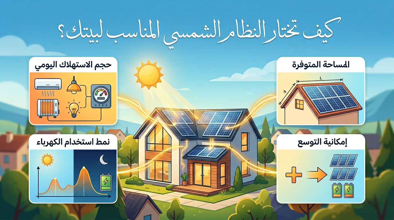 - اختيار نوع النظام: حدد إذا كنت تحتاج نظامًا مستقلًا، أم متصلًا بالشبكة، أم نظامًا هجينًا حسب وضعك.