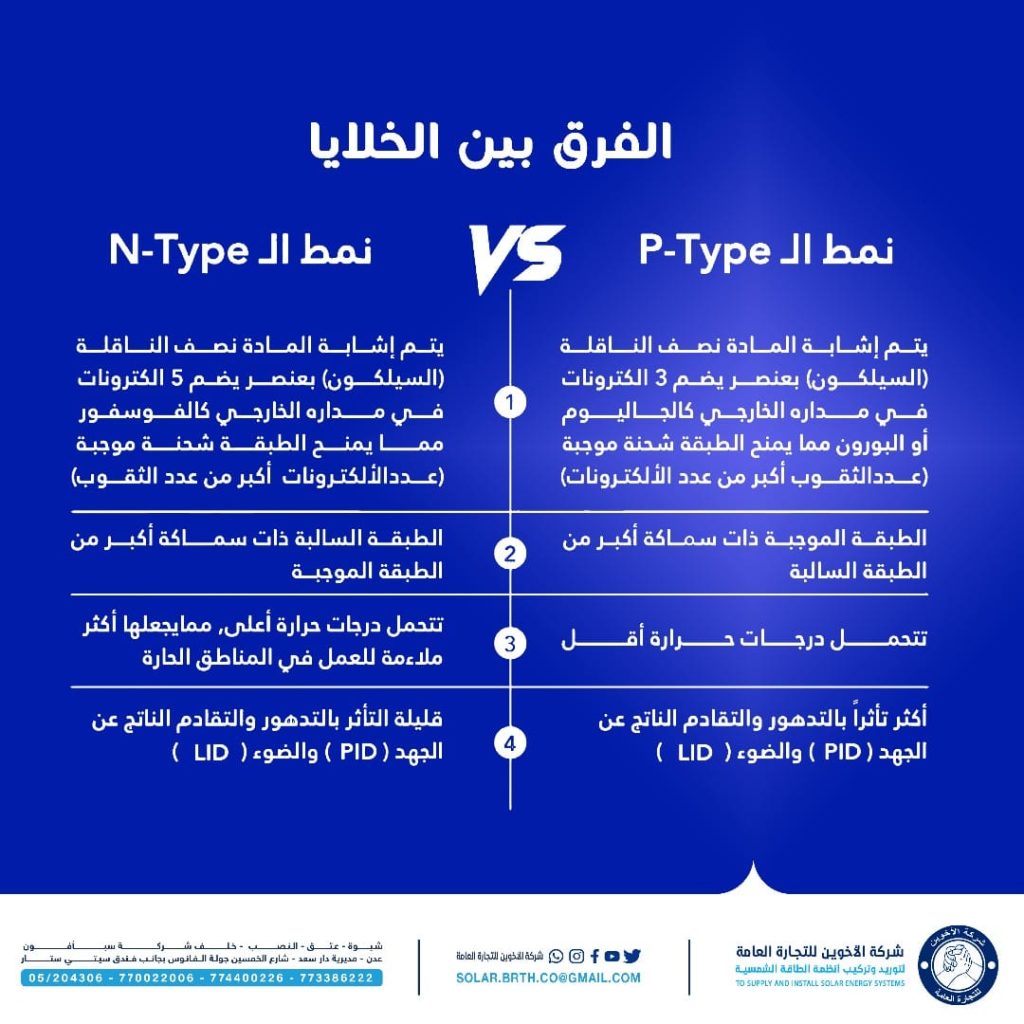 - N-Type (النوع السالب): يتم إضافة عنصر مثل الفوسفور الذي يحتوي على 5 إلكترونات، مما يجعل هذه الإلكترونات الحرة هي المسئولة عن نقل التيار الكهربائي، وهو أحدث تقنيًا، ويمتاز بأنه يحتفظ بكفاءته لفترات أطول، كما أن كفاءته في تحويل الطاقة الشمسية إلى كهرباء أعلى من النوع P، لكنه أغلى ثمنًا.